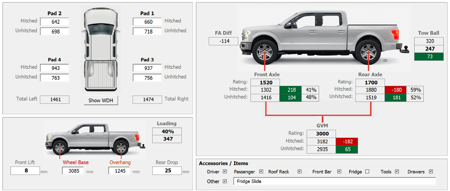 The total vehicle weight is recorded and measured against the Gross Vehicle Mass (GVM) rating for your vehicle.